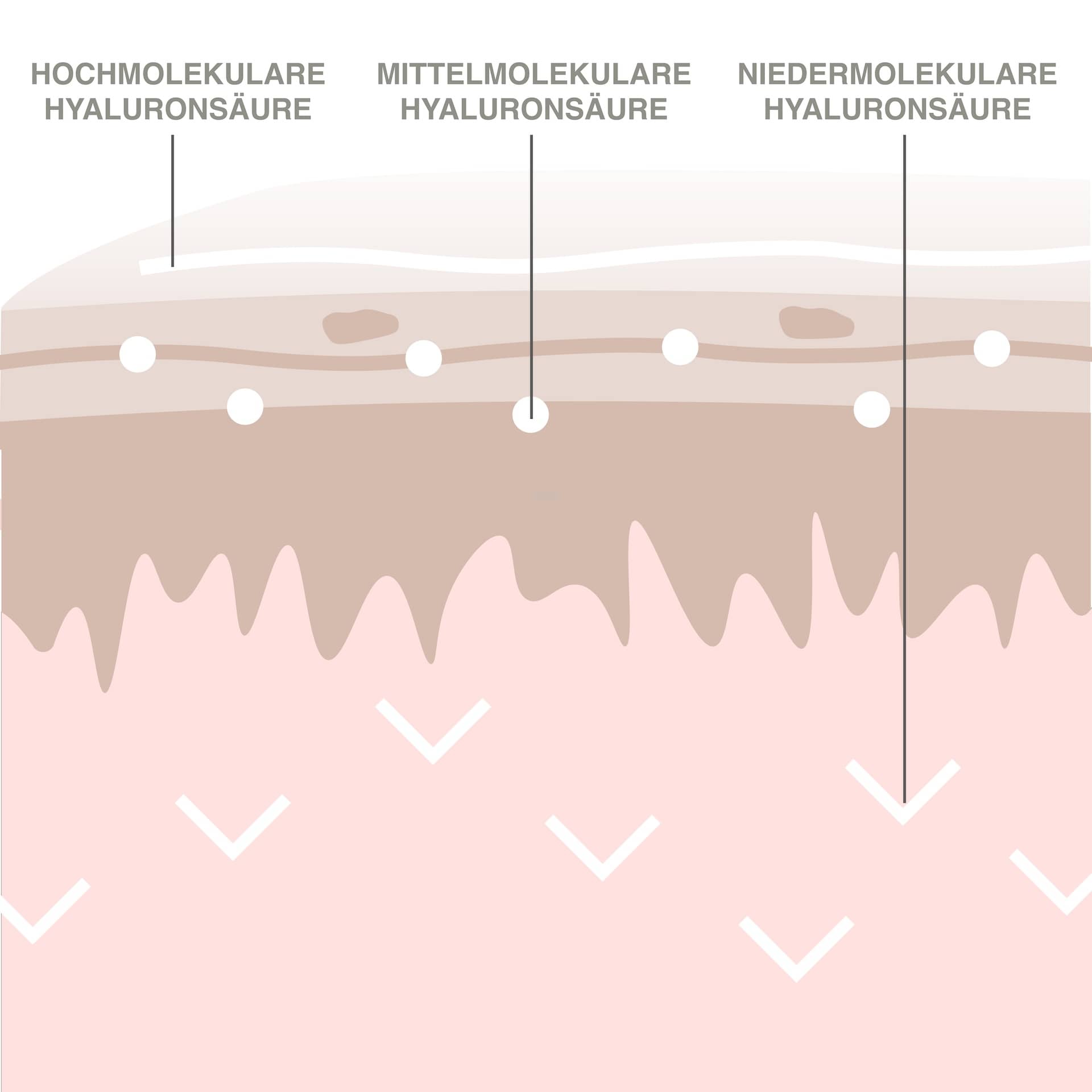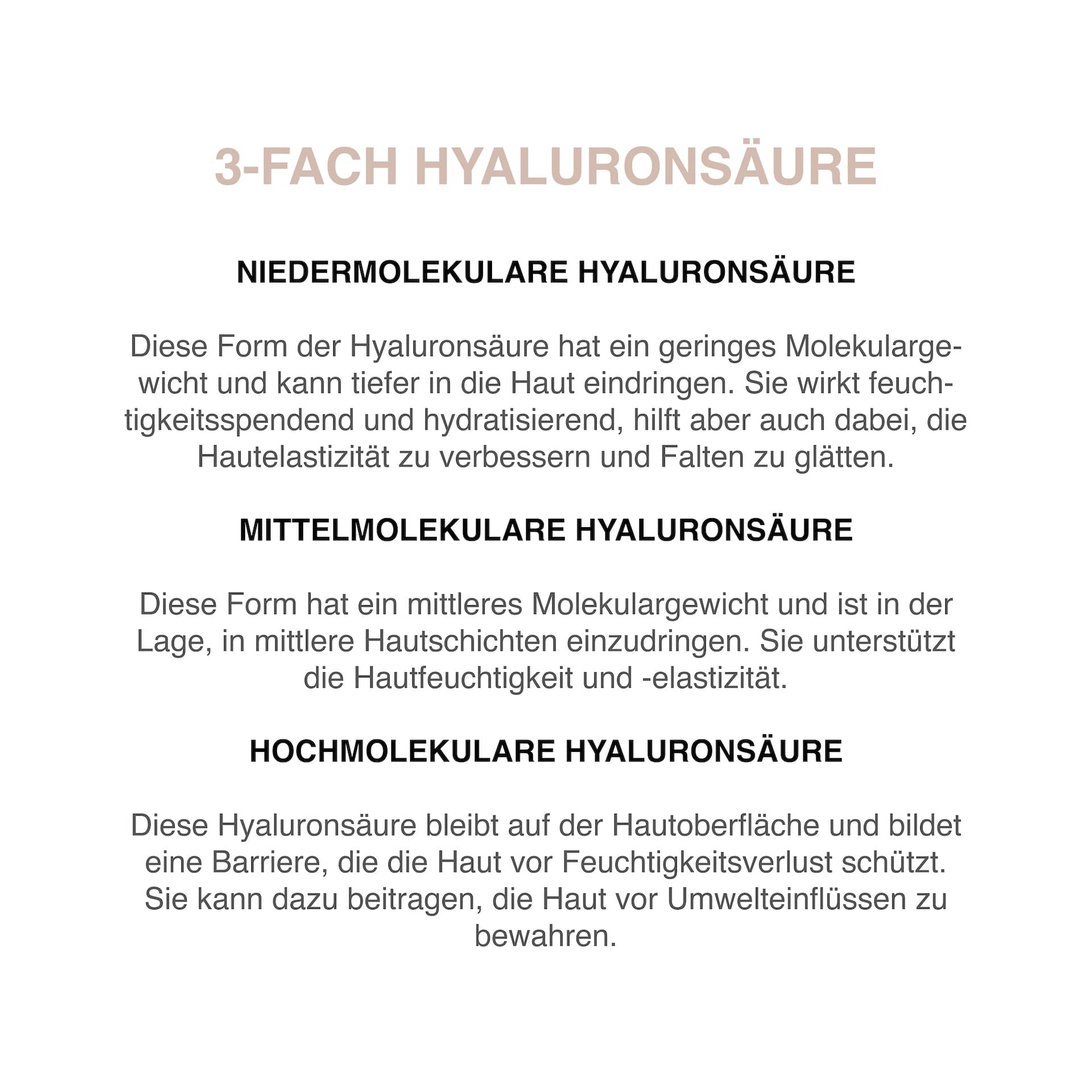 Es gibt verschiedene Hyaluronsäuren, die sich in der Größe ihrer Moleküle unterscheiden. Im Fachjargon werden hierfür die Begriffe nieder-, mittel- und hochmolekular verwendet. Das Besondere der 3-fach Hyaluronsäure ist, dass sie die Vorteile von Hyaluronsäure auf verschiedene Ebenen der Haut bietet. Niedermolekulare Hyaluronsäure kann tiefe Hydratation und Anti-Aging-Vorteile bieten, während mittel- und hochmolekulare Hyaluronsäure die Feuchtigkeitsbarriere der Haut schützen und stärken können.