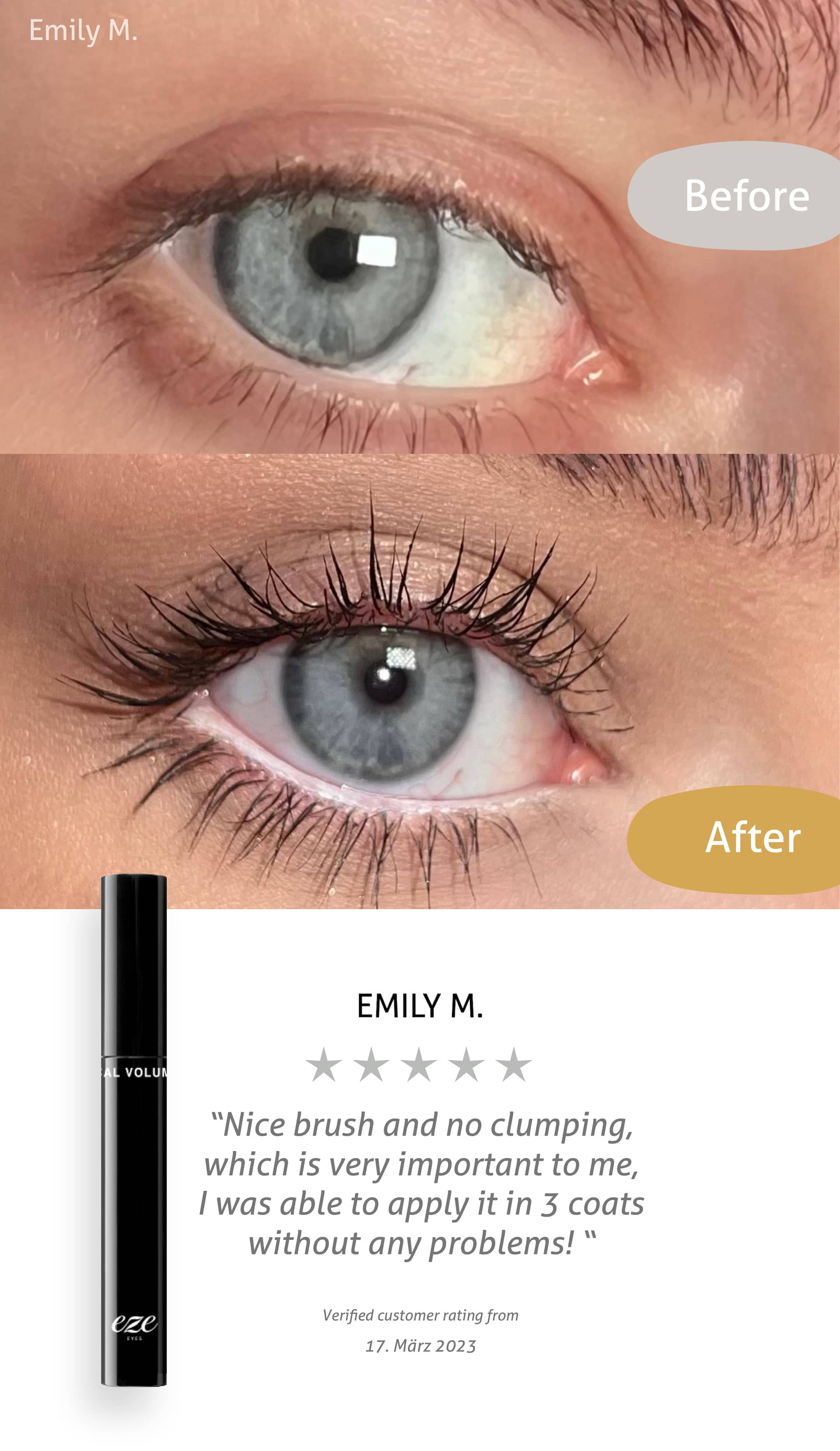 Bin total begeistert! Habe die Mascara bei Rike gesehen und direkt mal bestellt. So toll! Verklebt nicht und macht schöne lange Wimpern :) Danke!
