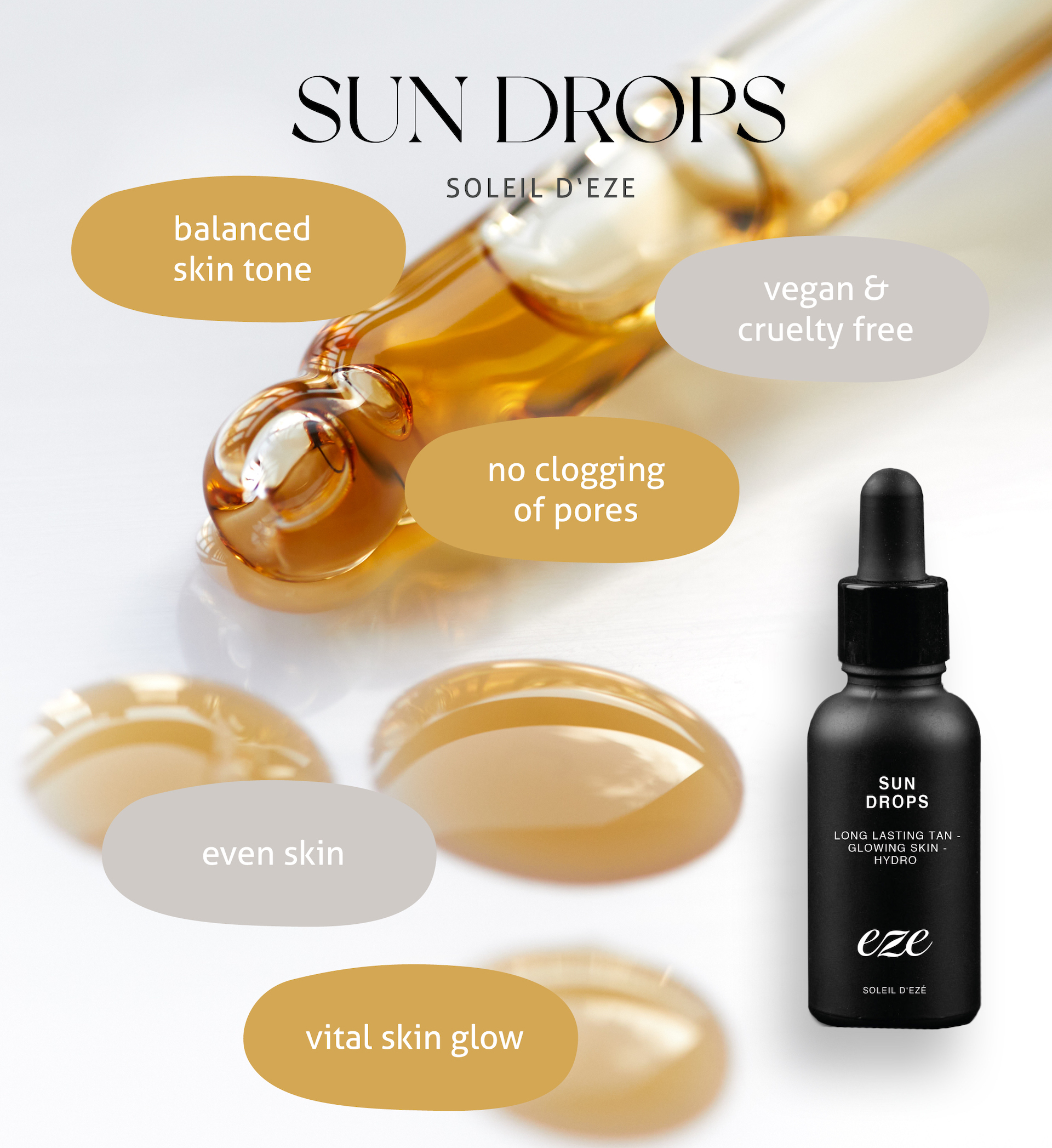 A sun-kissed, fresh complexion is a beautiful beauty accessory. Our Sun Drops give your face, neck and décolleté a radiantly soft and natural tan that is easy to build up.