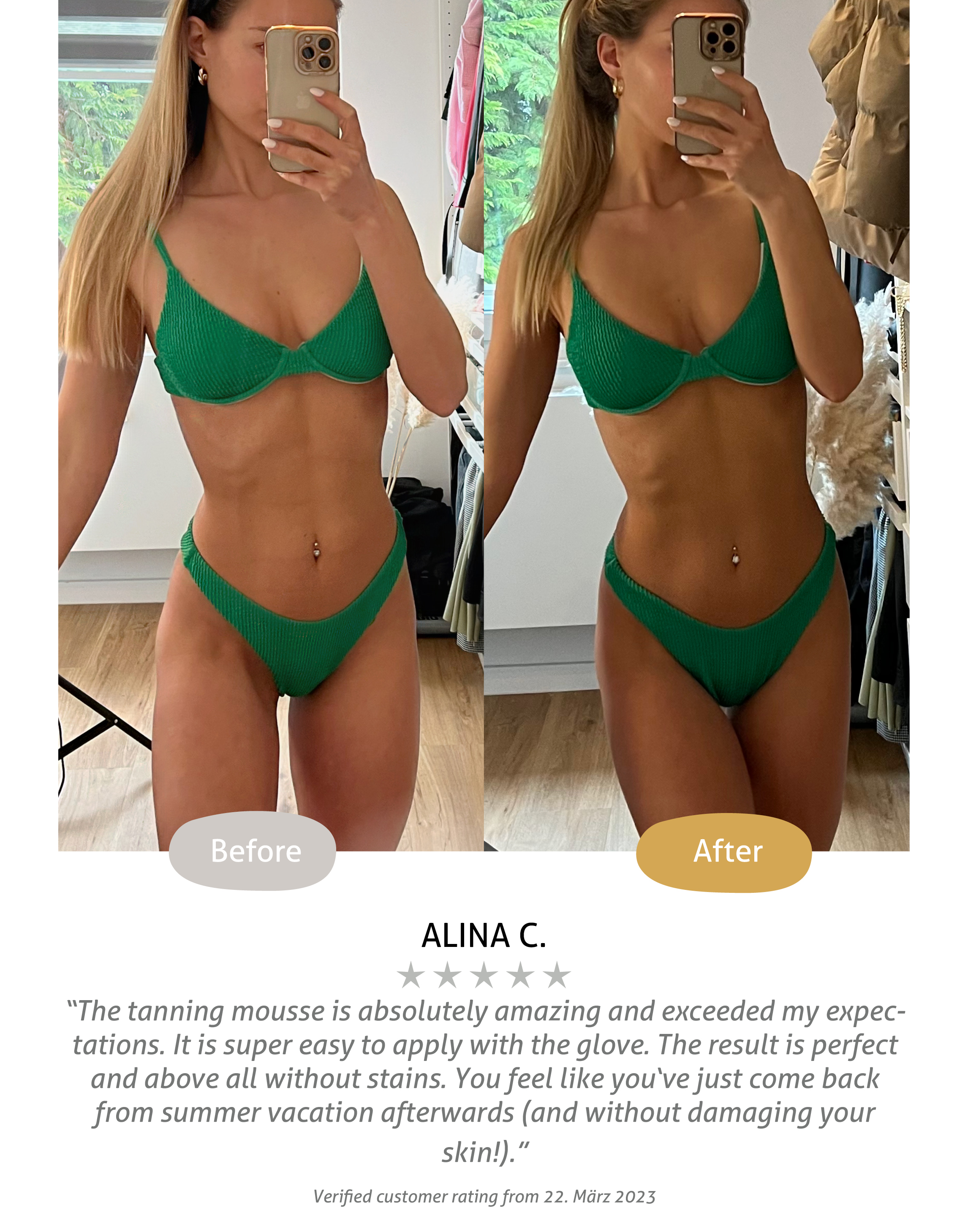Das Mousse ist ein Gamechanger! Es verleiht mir eine natürliche Bräune. Es lässt sich gleichmäßig auftragen und wir dnicht fleckig. Die Formel ist leicht und hinterlässt meine Haut hydratisiert. Ein perfekter Weg zu einem sonnengeküssten Look, ohne sich der Sonne aussetzen zu müssen